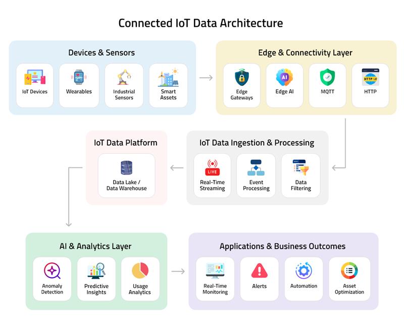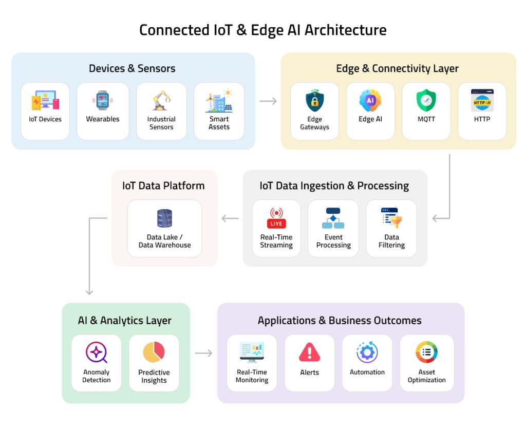 This architecture enables organizations to collect data from connected devices, process it through edge and cloud platforms, and apply AI models to generate real-time insights.